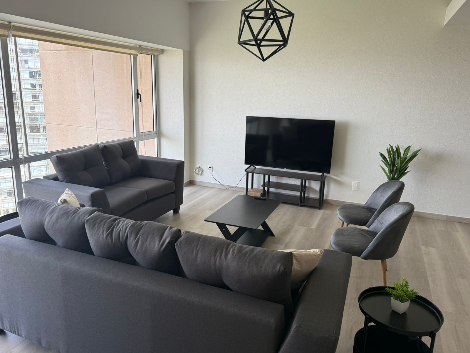 sofás, mesa con sillas y TV
